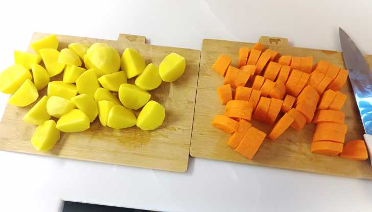 Картофелины берём не крупные и нарезаем пополам. Морковь нарезаем полукружочками (но не сильно тонкими).