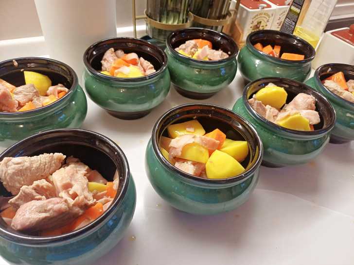 Включаем духовку и разогреваем до 220 градусов. Раскладываем всё по горшочкам.