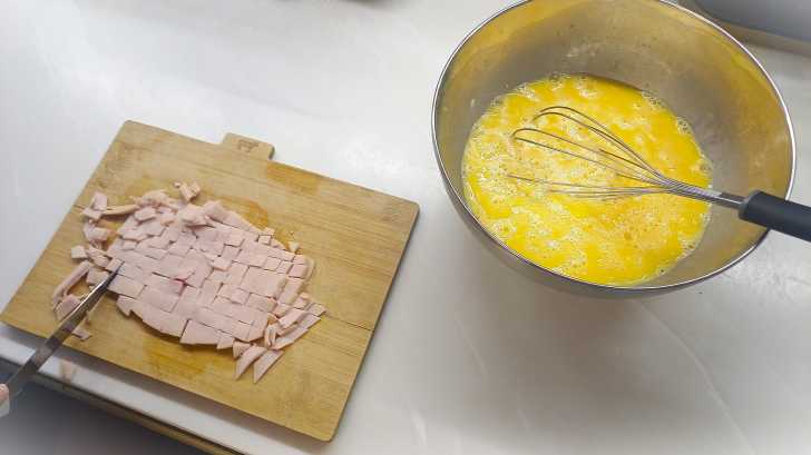 Затем добавляем мелко нарезанную ветчину и снова перемешиваем.
