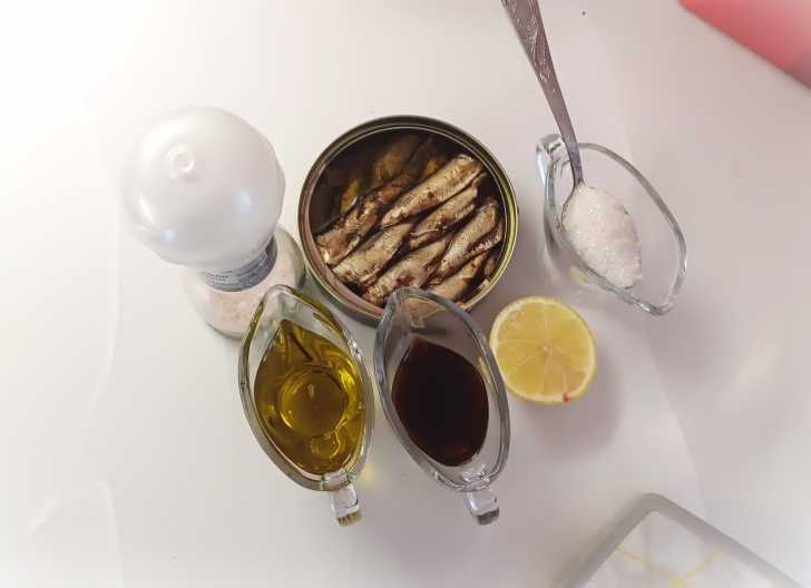Берём шпроты, масло, соевый соус, сок лайма, сахар, немного соли.