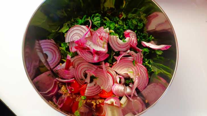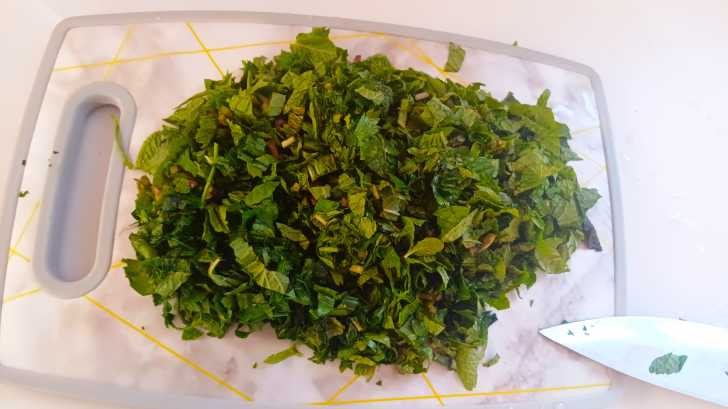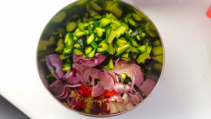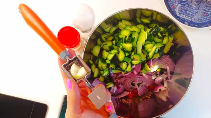 Добавляем истолчённый чеснок, солим и перчим. Перемешиваем.