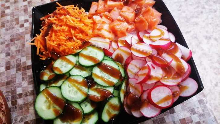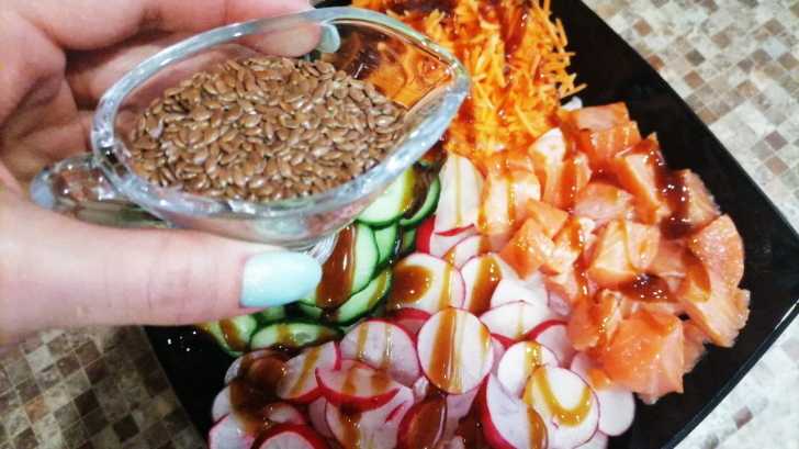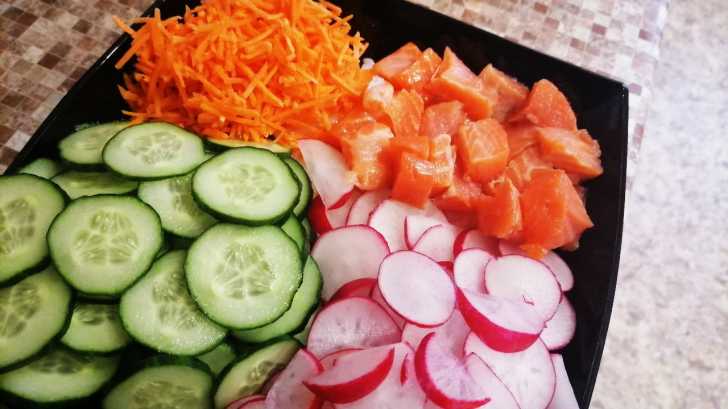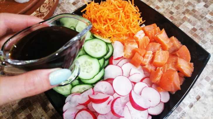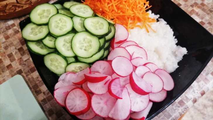 Далее, по такому же принципу, раскладываем редис (нарезанный тонкими кружочками) и морковь.