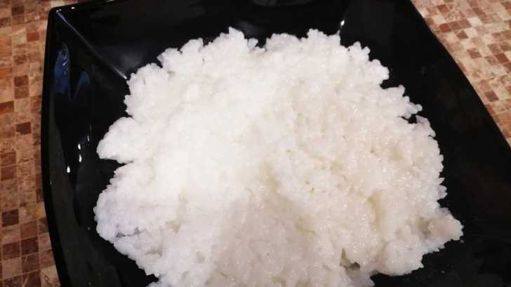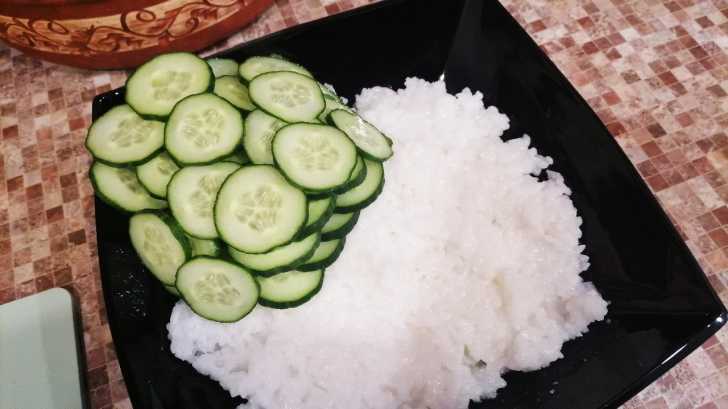 Нарезаем огурец тонкими кружочками и укладываем, чтобы покрыть лишь 1/4 риса.