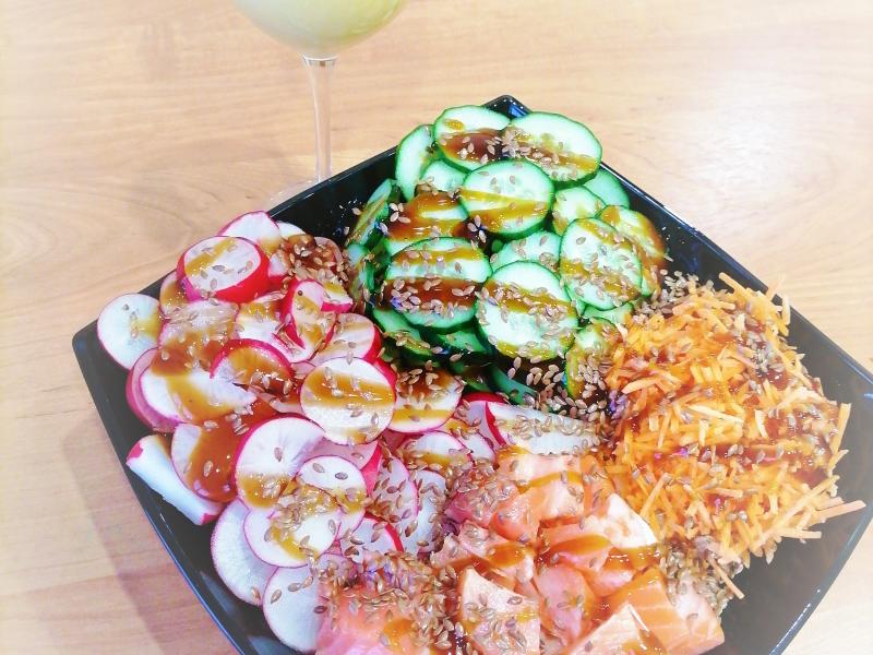 Перекладываем его в красивую глубокую тарелку (берите покрупнее, ингредиентов не мало). Поливаем кунжутным маслом, солим и перемешиваем.