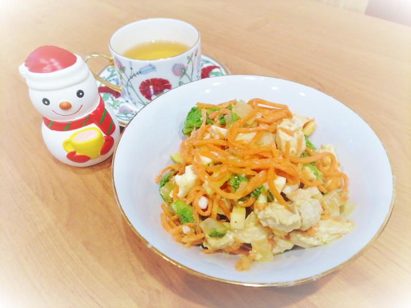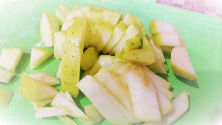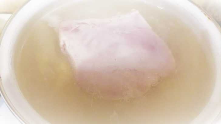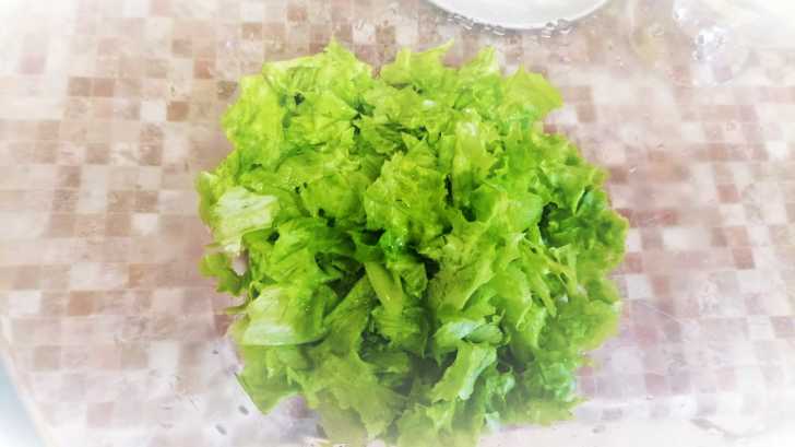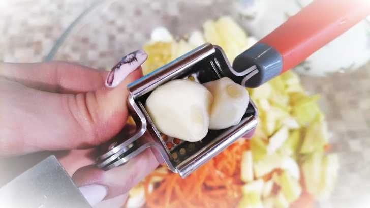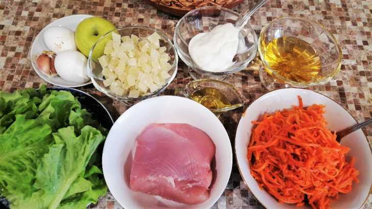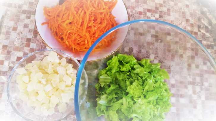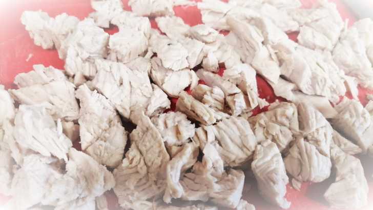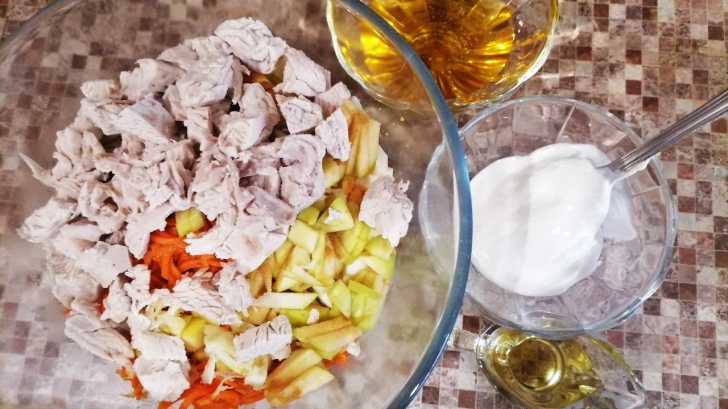 Мясо уже должно было остыть, мы нарезаем его небольшими кусочками и отправляем к салату.