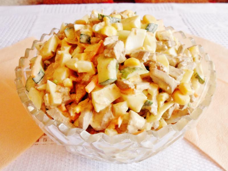 - Тщательно смешиваем майонез и горчицу, заправляем полученным соусом наш салат и всё перемешиваем.