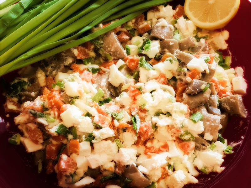 - Смешиваем все ингредиенты, солим и заправляем сметаной.