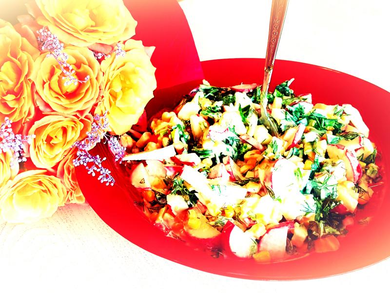 - Смешиваем все ингредиенты, солим, перчим и заправляем майонезом.