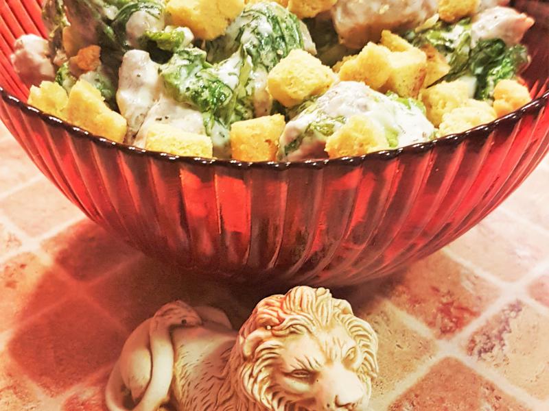 - Смешиваем все ингредиенты (кроме сухариков), солим и заправляем майонезом;