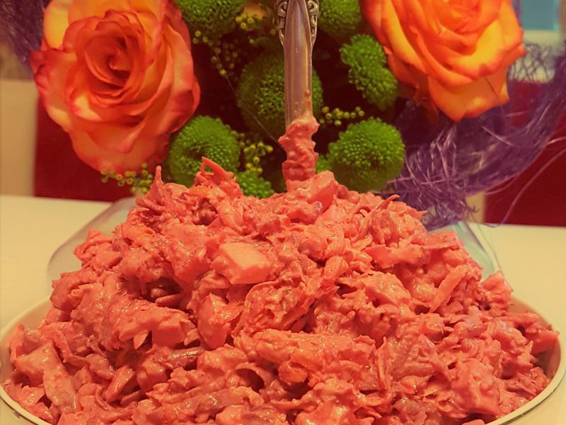 - Варим свеклу 30 минут в кипящей воде, затем остужаем немного и натираем на крупной тёрке;