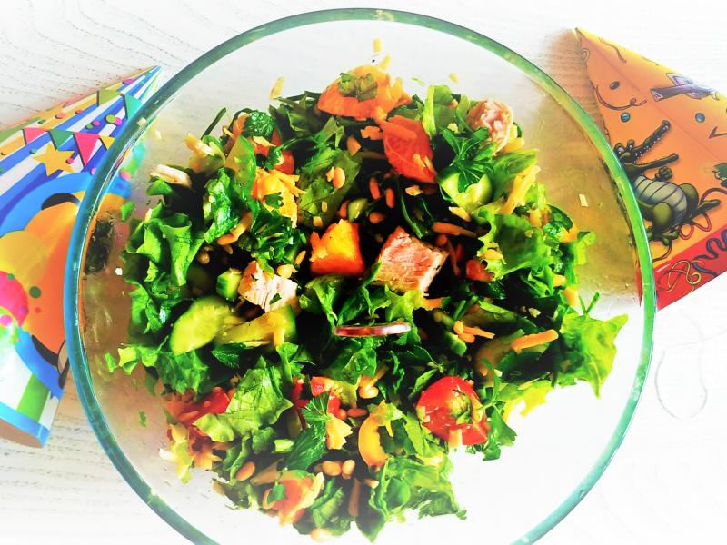 - Петрушку мелко рубим, а листья салата рвём руками;