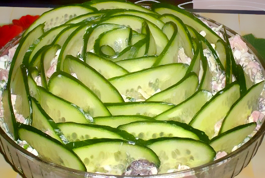 Нарезать тоненькие полоски огурца и, начиная с макушки, по часовой стрелке наискось поочередно вдавливать в салат до самого низа.
