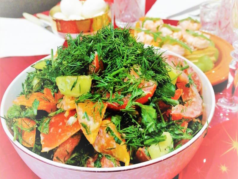 - Смешиваем все ингридиенты, кроме укропа, солим, перчим и заправляем оливковым маслом;