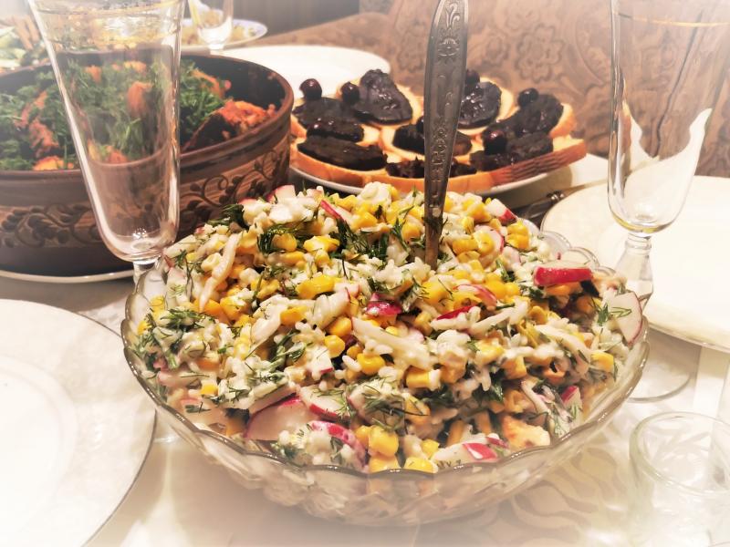 - Смешиваем все ингредиенты, солим и заправляем майонезом.