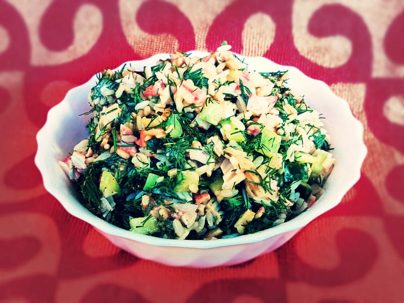 - Смешиваем все ингредиенты, солим, перчим и заправляем смесью сметаны и томатной пасты.