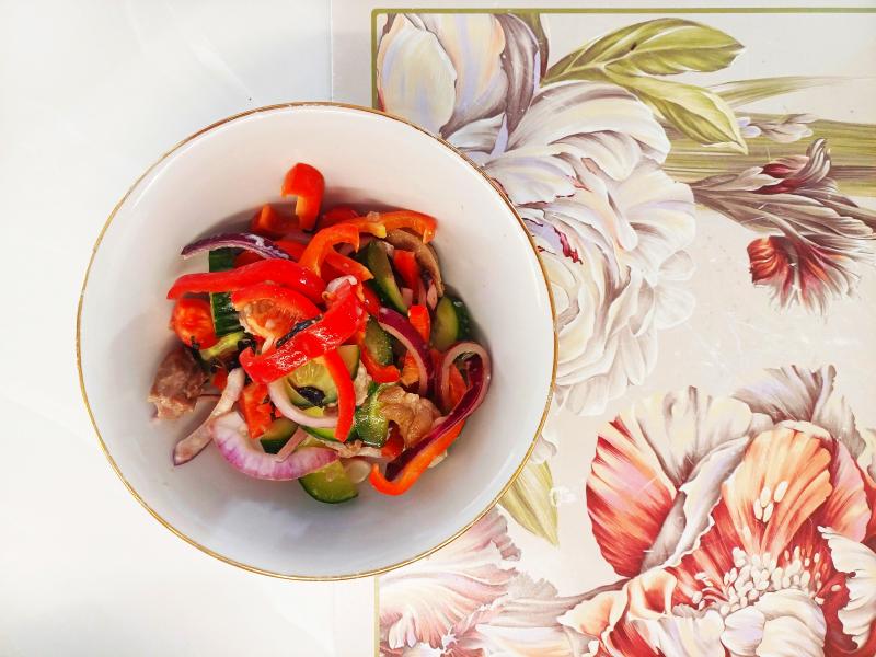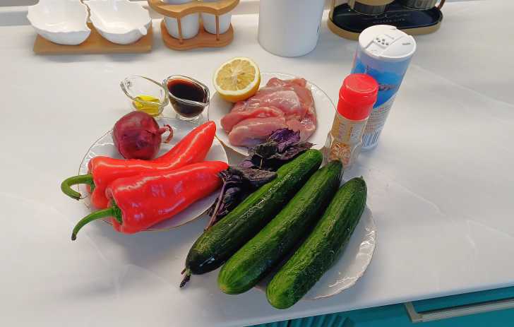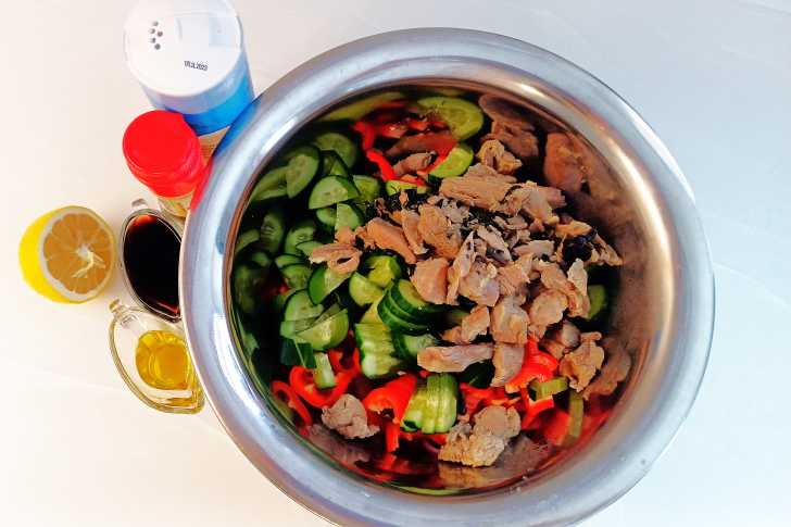 Добавляем наше мясо с базиликом ко всему остальному салату, вливаем сок лимона, оливковое масло, соевый соус, солим, перчим и тщательно перемешиваем.