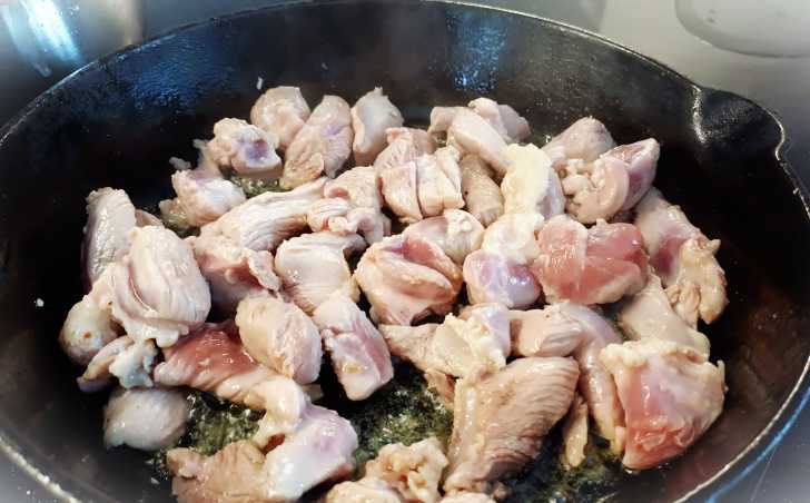 Обжариваем до готовности, некрупно нарезанное, мясо, не забываем его посолить.