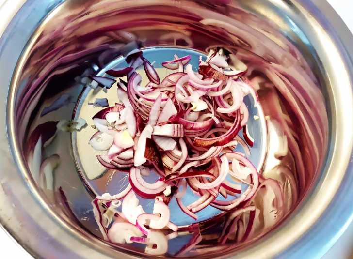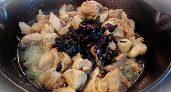 Когда мясо готово полностью, добавляем к нему базилик, мелко нарезанный, перемешиваем и выключаем огонь.