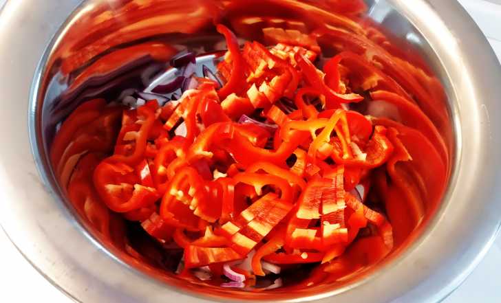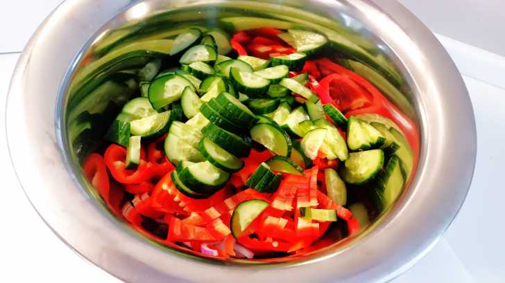 Огурцы нарезаем дольками. Все овощи соединяем.