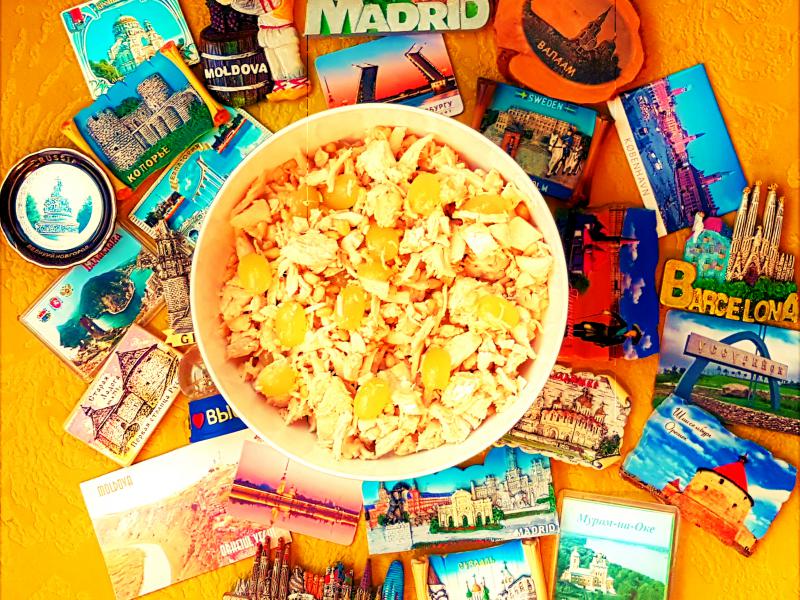 - Куриное филе варим 40 минут в подсоленной воде, остужаем и нарезаем соломкой;