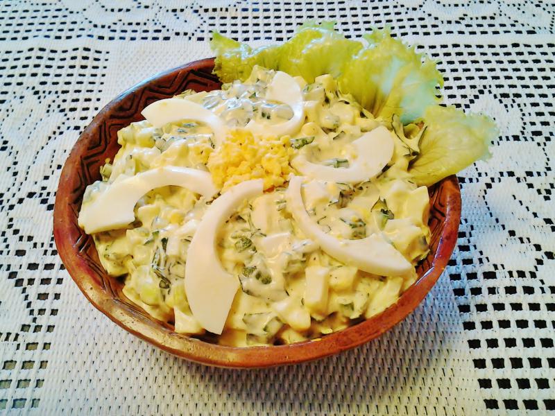 - Заправляем всё майонезом, добавляем мелко порубленный зелёный лучок, солим, перемешиваем и перед подачей украшаем яйцом (как показанно на фотографии).
