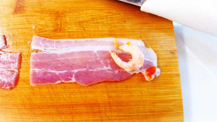 Берём ломтик бекона, нарезаем его пополам и заворачиваем креветку в половинку.