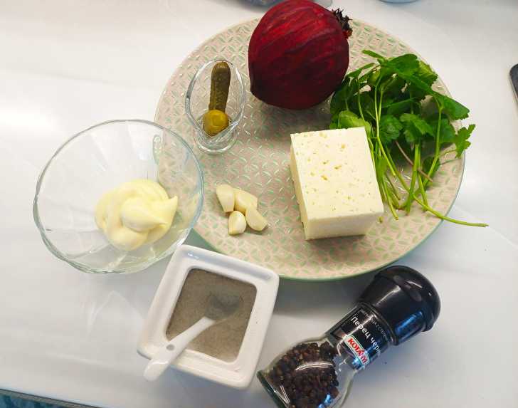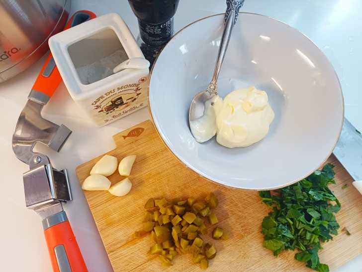Смешиваем истолчённый чеснок, мелко нарезанный огурец, мелко порубленную зелень, майонез, солим и перчим.