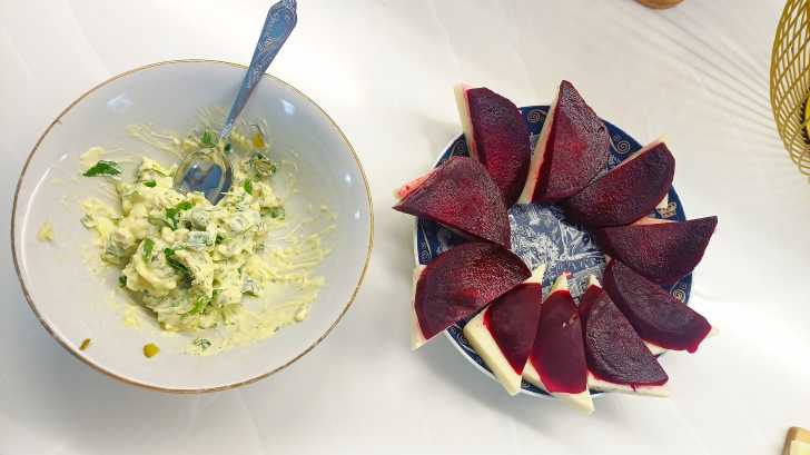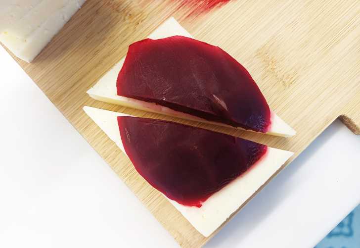 Выкладываем на сыр кружочек свеклы и разрезаем по диагонали (у нас получаются два треугольничка).