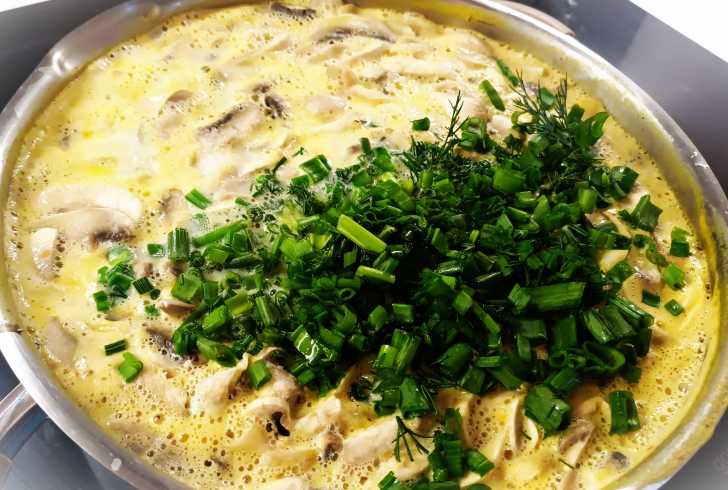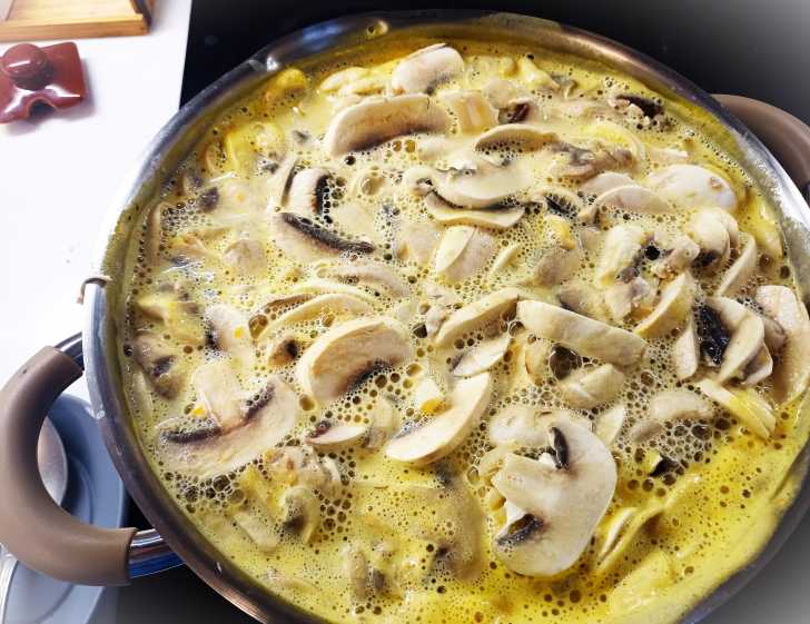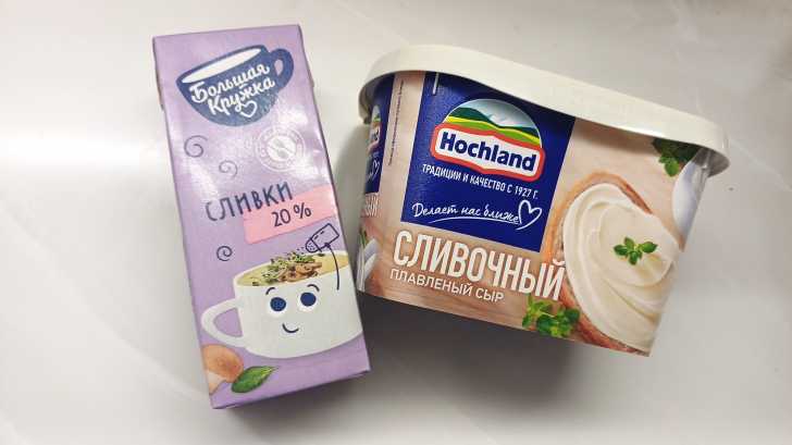Снова ставим кастрюлю на огонь (средний). Не смотрите, что пока выглядит жидковато. Всё будет ещё доходить и томиться. Закладываем в кастрюлю плавленный сыр, вливаем сливки и тщательно перемешиваем.