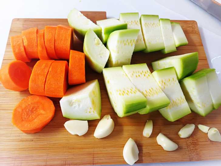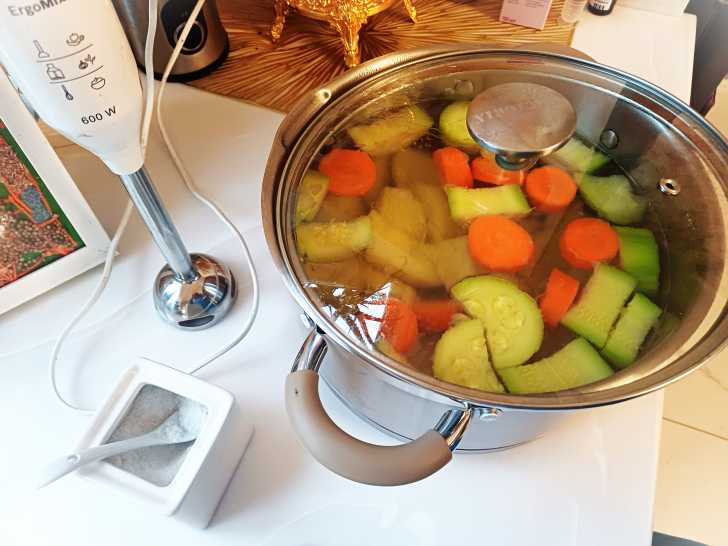 Затем добавляем туда же нарезанные морковь и кабачок (мелко можно их не нарезать, так как потом всё-равно будем блендировать).